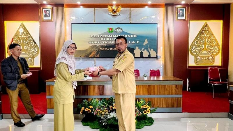 Desa Pandean, Kecamatan Ngablak, Kabupaten Magelang — Pemerintah Desa Pandean menyelenggarakan kegiatan penerimaan honor bagi Guru TK Pertiwi 1 & 2 serta Guru PAUD sebagai bentuk apresiasi dan dukungan terhadap peran penting pendidik anak usia dini dalam mencerdaskan generasi penerus bangsa. Kegiatan ini bertujuan untuk meningkatkan kesejahteraan guru sekaligus memperkuat komitmen bersama dalam pengembangan pendidikan anak usia dini. Acara tersebut dilaksanakan pada tahun 2025 dan bertempat di Aula Rajawali Desa Pandean, Kecamatan Ngablak, Kabupaten Magelang.